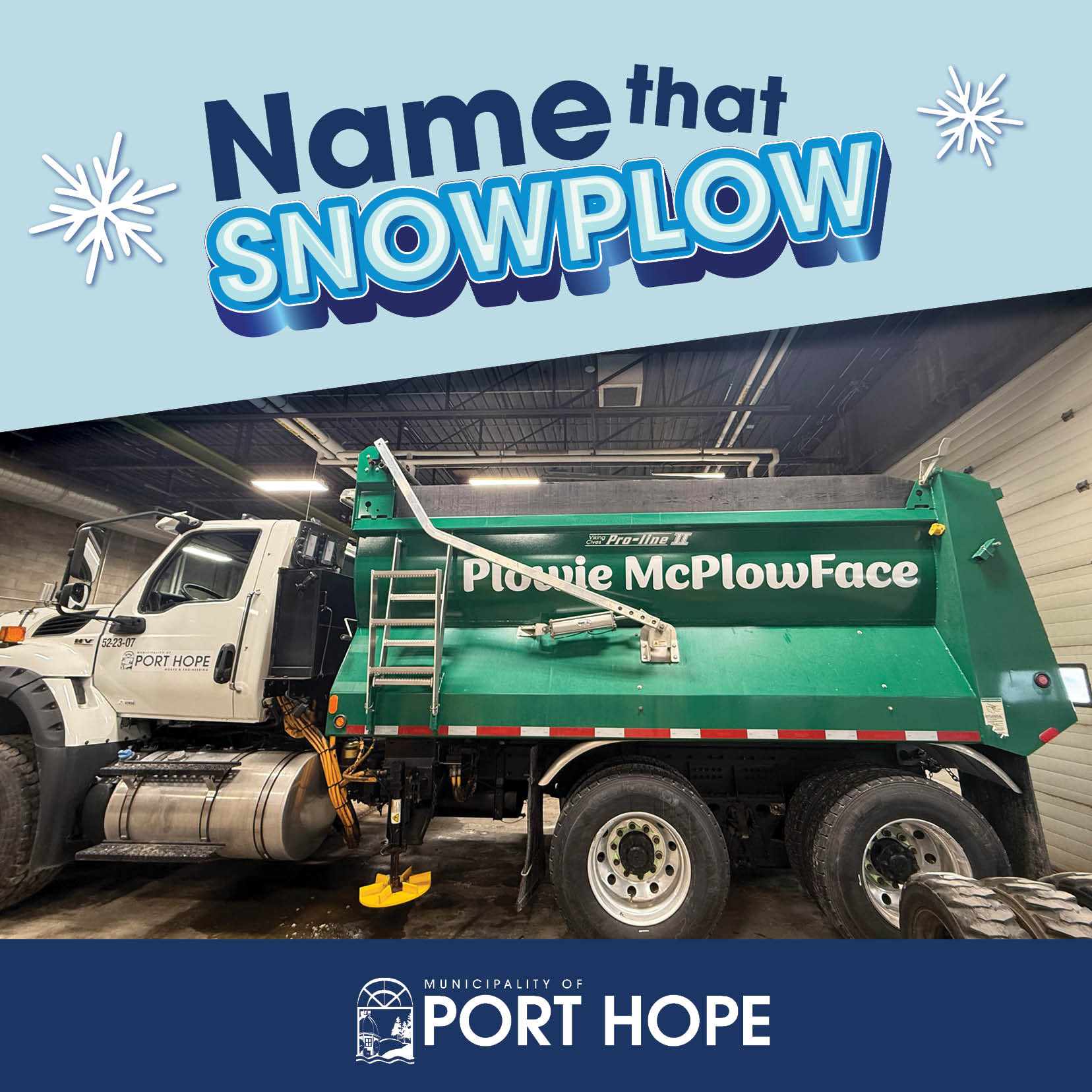 The Name that Plow initiative is all in good fun, but snow clearing in Port Hope is serious business. With each upcoming winter weather event, our road crews are responsible for clearing approximately 681 kilometres of roadway. The Municipality is able to accomplish this with over 11 pieces of plowing equipment.